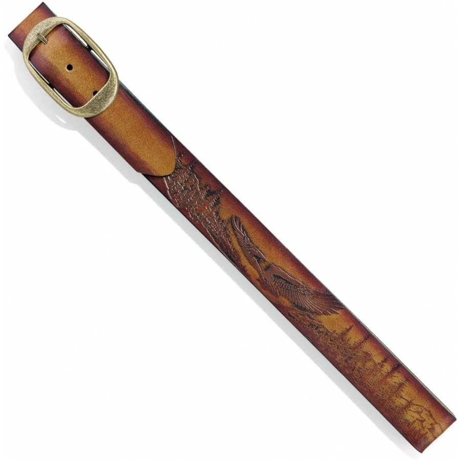 The great outdoors is subtly and elegantly captured on this rustic leather belt featuring and etched eagle and mountain scene.
