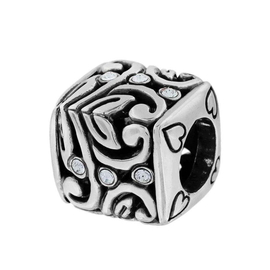 Three fine quality crystals, all in a row, embellish this cubed bead. Its pierced leaf and openwork scrolls match the Giardino collection, making this bead a pretty mix-and-matcher!