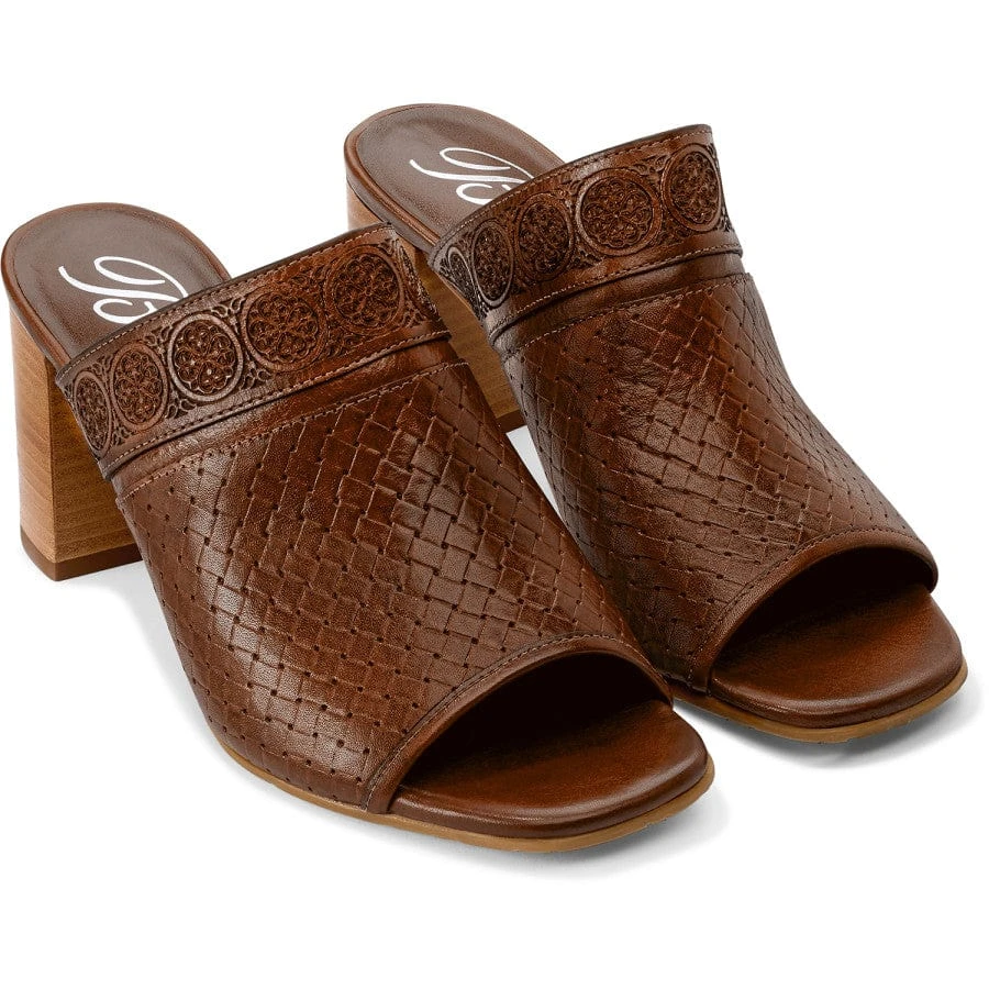 Stamped to look as though it is woven, this luxe leather vamp is hand finished, with embossed Ferrara medallions around the top. A stacked block heel lends a flattering lift to the leg.