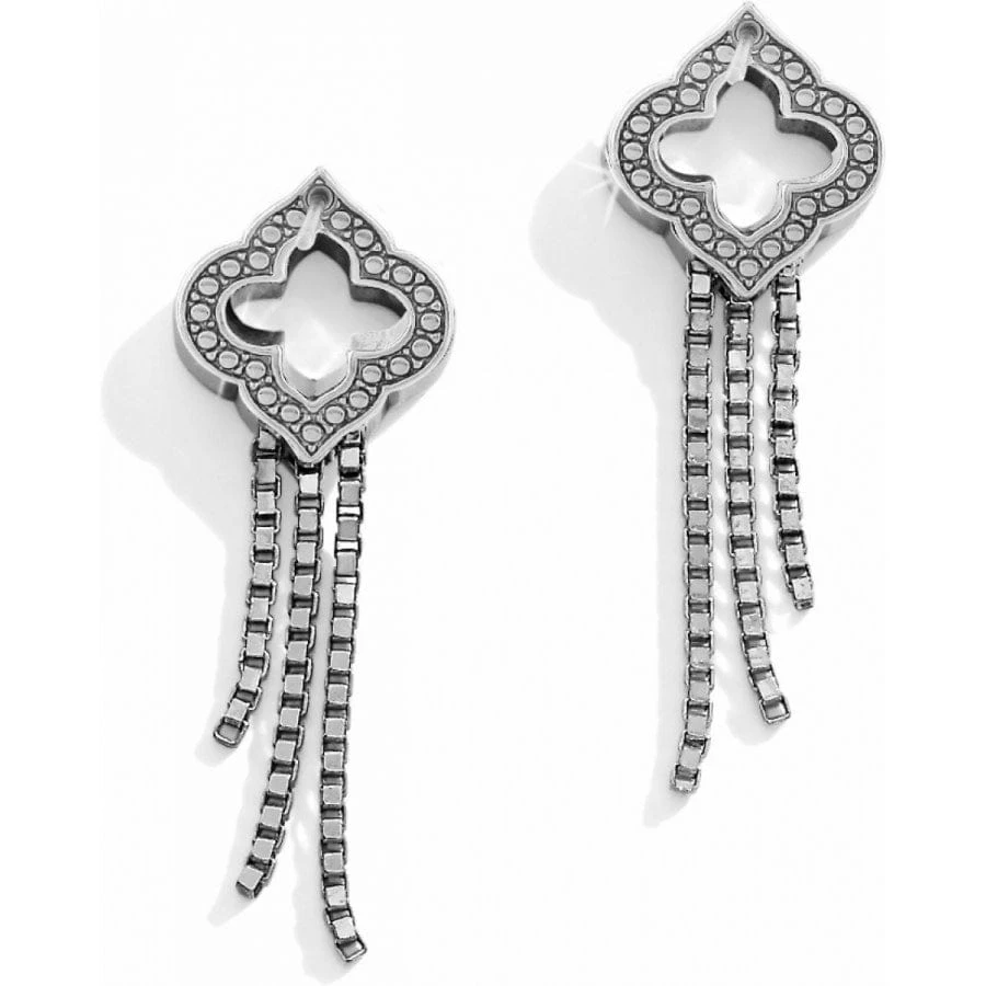 Beautiful Moorish inspiration plays out on these eye-catching earrings, featuring crystal encrusted quatrefoils. The exquisite arabesque design is further enhanced by the swingy chains that drop like tassels.