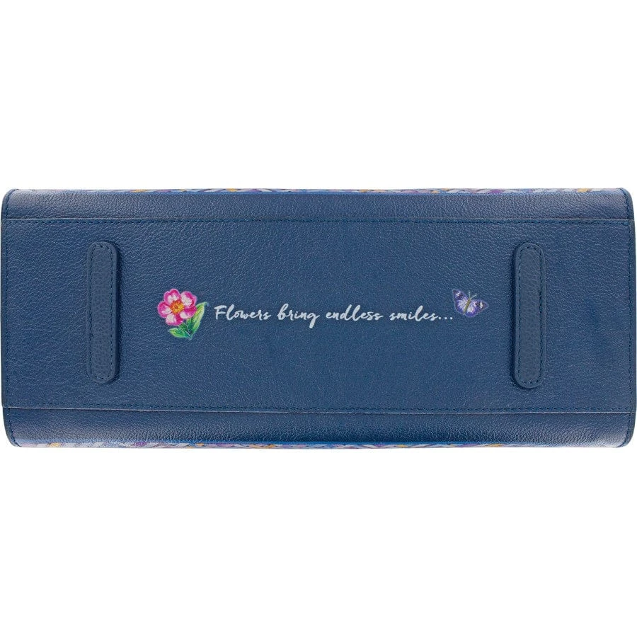 Inspired by a trellis garden and the baskets that collect picked flowers, this tote is printed with our designer’s hand-painted watercolor images on every side of the bag. A few butterflies flutter through the continuous artwork. Tote bottom states ‘Flowers bring endless smiles…”